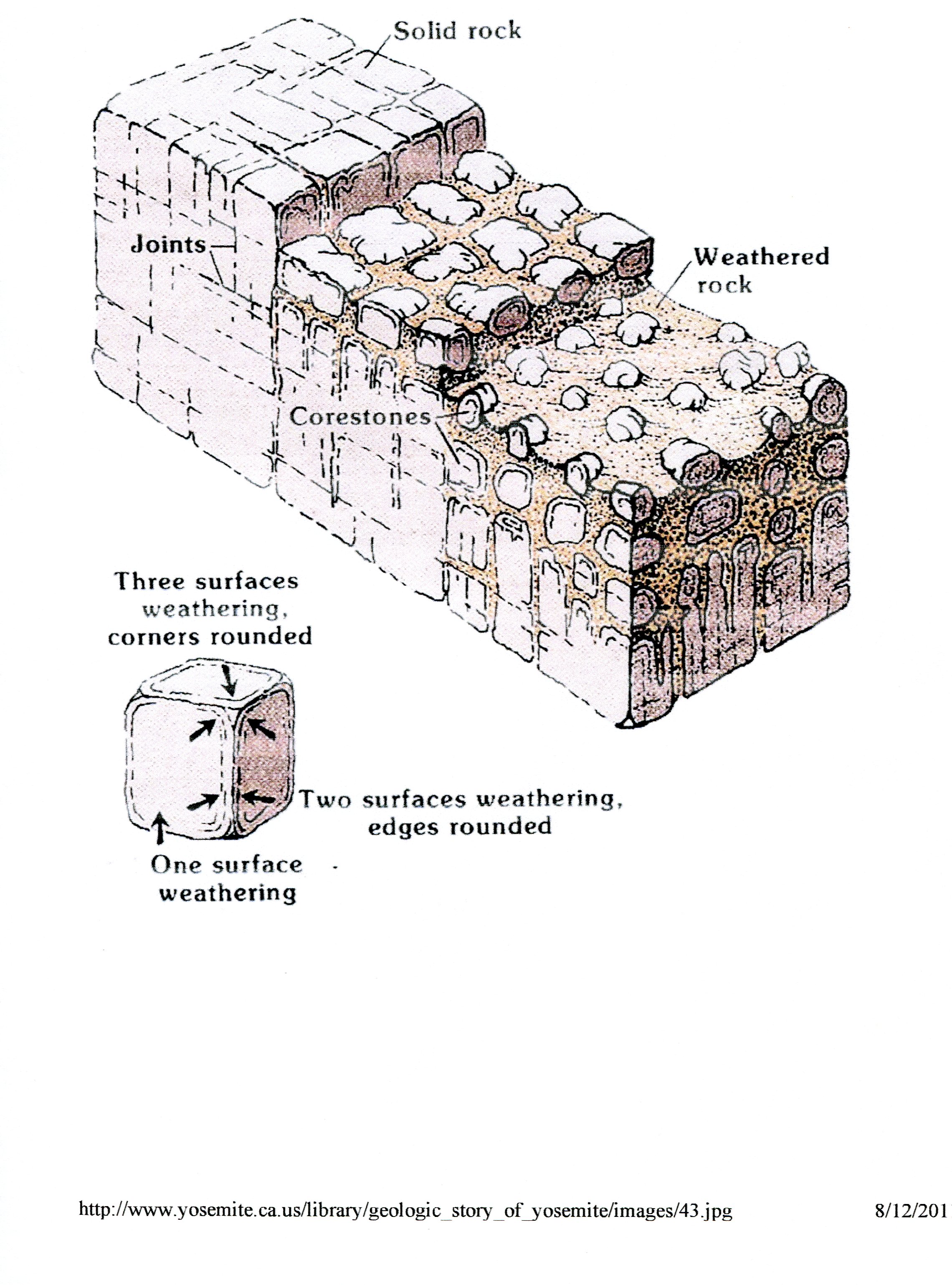 Figure 1: Schematic drawing of corestones forming from rock weathering (Credit: M. K. Hubbert). The soft, clay-rich weathering product surrounding the corestones is called saprolite (see Figure 2).