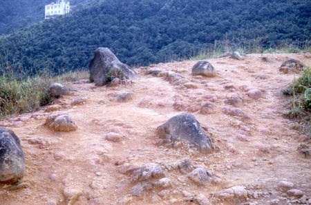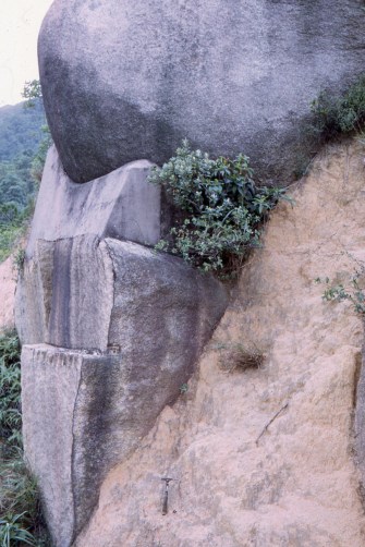 Vegetation destruction became extensive in southern China in the Sung Dynasty, some 1000 years ago. This was probably the time when many core stones were released and began movement downhill. Some corestones even show up in Chinese art. For instance, many paintings of Hong Kong island during the 1700s and 1800s clearly show corestones on steep hillsides. Figure 6 is an example of Chinese wall paper produced in a southern province during the early 1800s showing corestones on the hills.