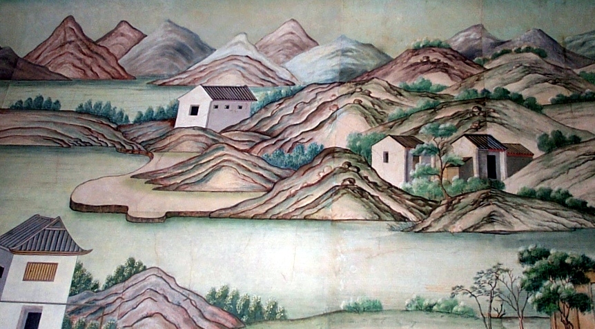 Figure 6: Chinese wall paper manufactured in southern China during the early 1800s shows corestones on hills near the houses (Photo by W. Parham).