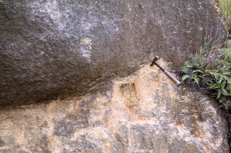 Figure 4: Contact between a corestone above and its supporting soft saprolite is marked by the geologic hammer (Photo by W. Parham).