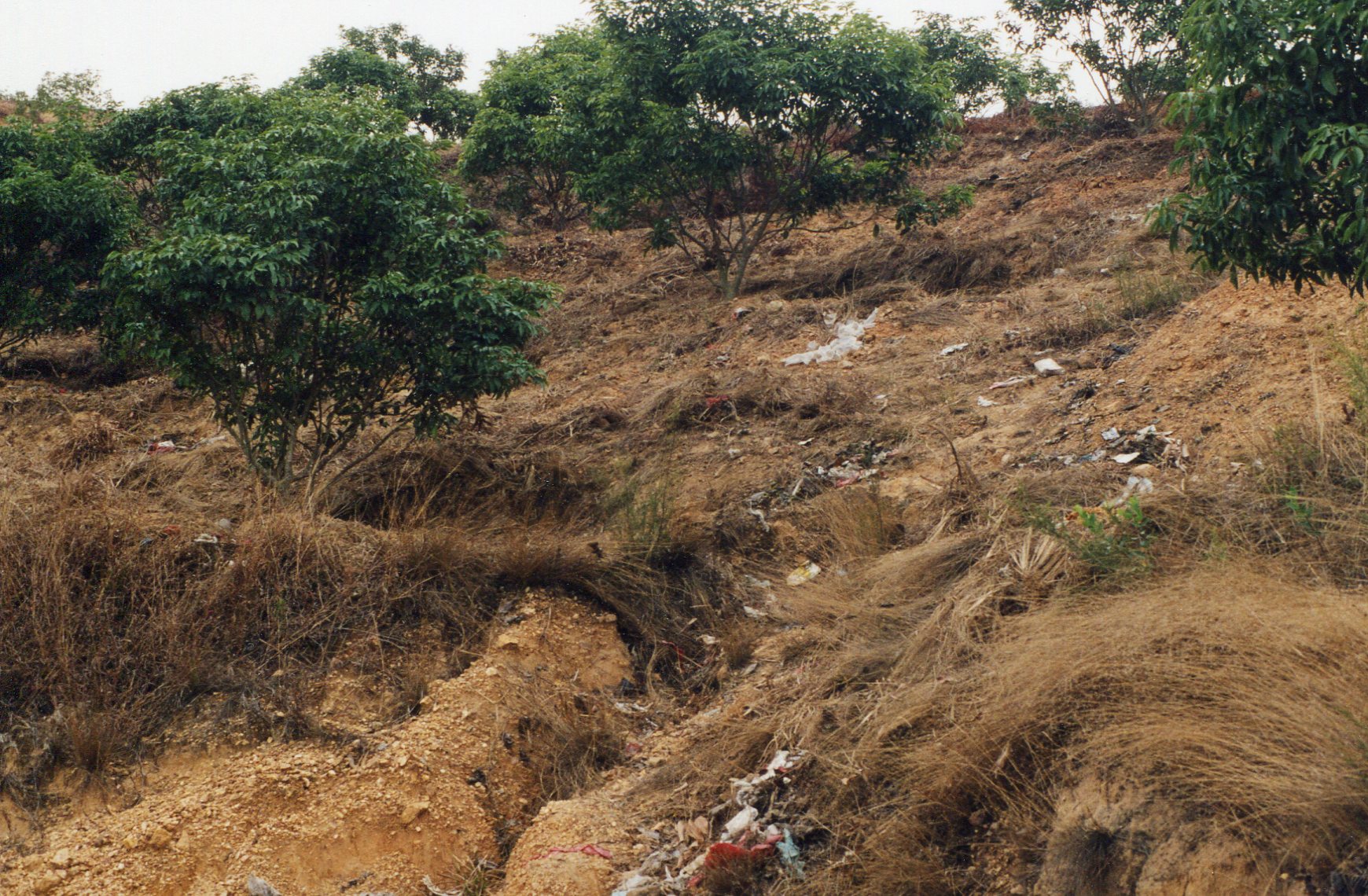 Figure 4: City waste used as fertilizer in a lychee plantation. The waste material are exposed by water erosion and scattered by wind; near Gaozhou, Guangdong (Photo by W. Parham, 1999).
