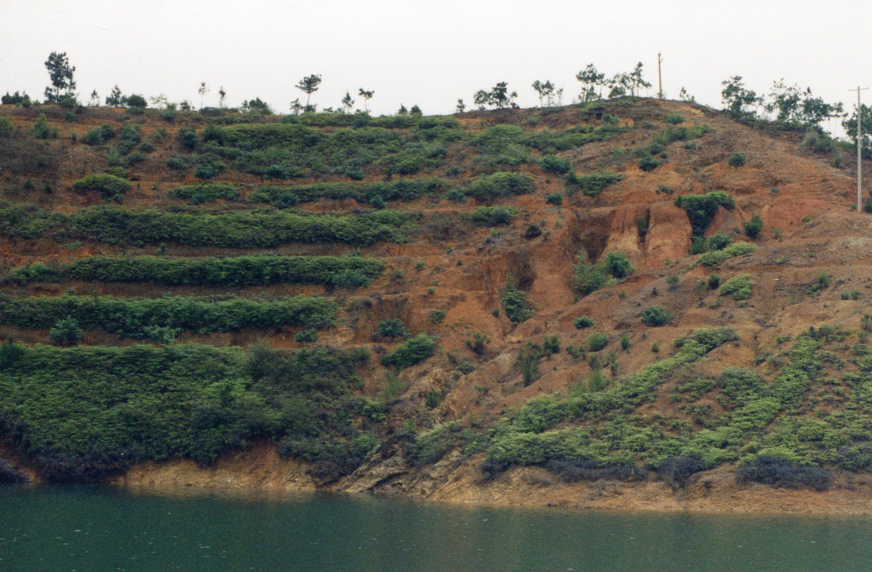 Figure 3: Terraces near Heyuan, Guangdong awaiting lychee plantings. Conservation forest here is almost nonexistent, and terrace erosion is underway (Photo by W. Parham, 1998).