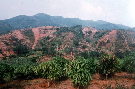 Figure 2: Lychee (Litchi chinensis) orchards near Maoming, Guangdong planted on erosion-prone land having slopes of 25 degrees or greater. Longan (Dimocarpus longan), a fruit tree related to the Lychee, is mostly planted on the lower slopes. Soil erosion is evident on these steep slopes (Photo by W. Parham, 1999).