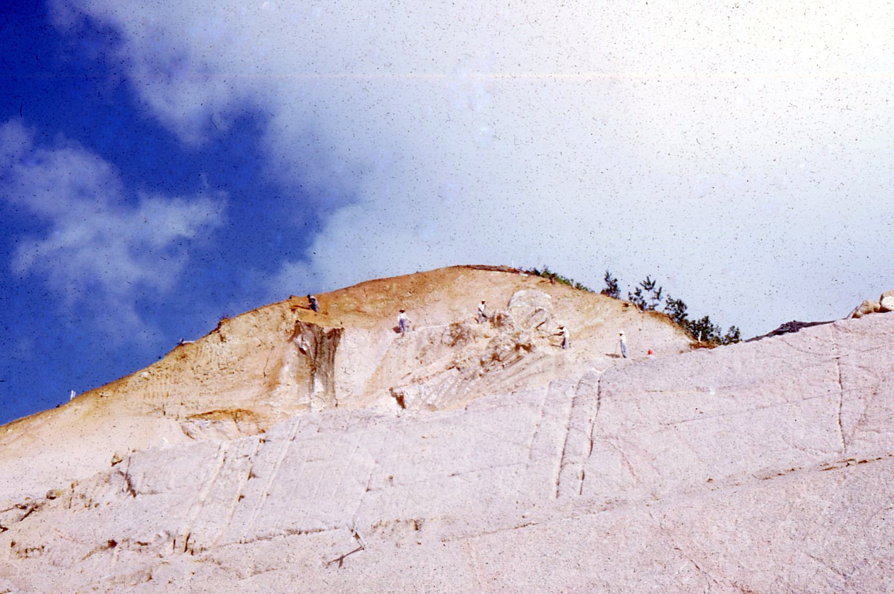 Figure 4: Deeply weathered granite, Kowloon, Hong Kong, 1967. For scale, note the workers along the top of cut (photo by W. Parham).